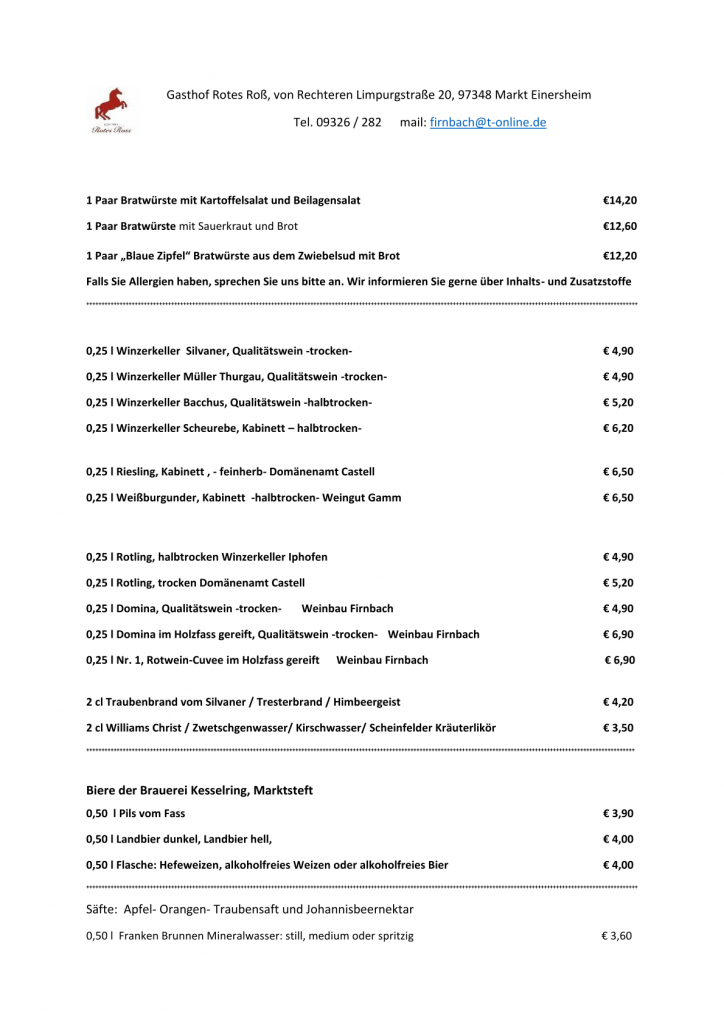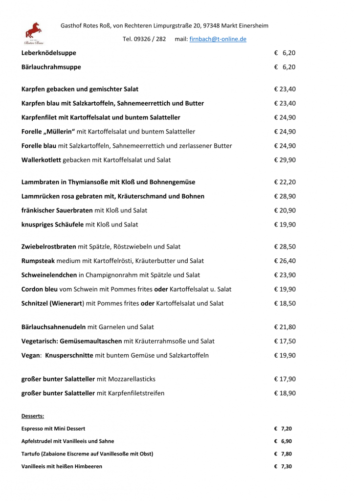 Aktuelle Speisekarte zum Verzehr im Restaurant